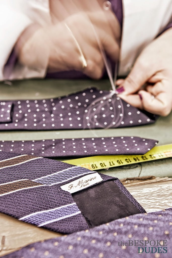 Ogni cravatta F. Marino è il frutto di un processo interamente artigianale, curato in ogni fase. Si parte dal taglio del tessuto, eseguito a mano seguendo il corretto sbieco, per garantire fluidità e resistenza. Si prosegue con la cucitura, realizzata con filo di cotone e punto a mano continuo, tratto distintivo della vera sartoria napoletana.
