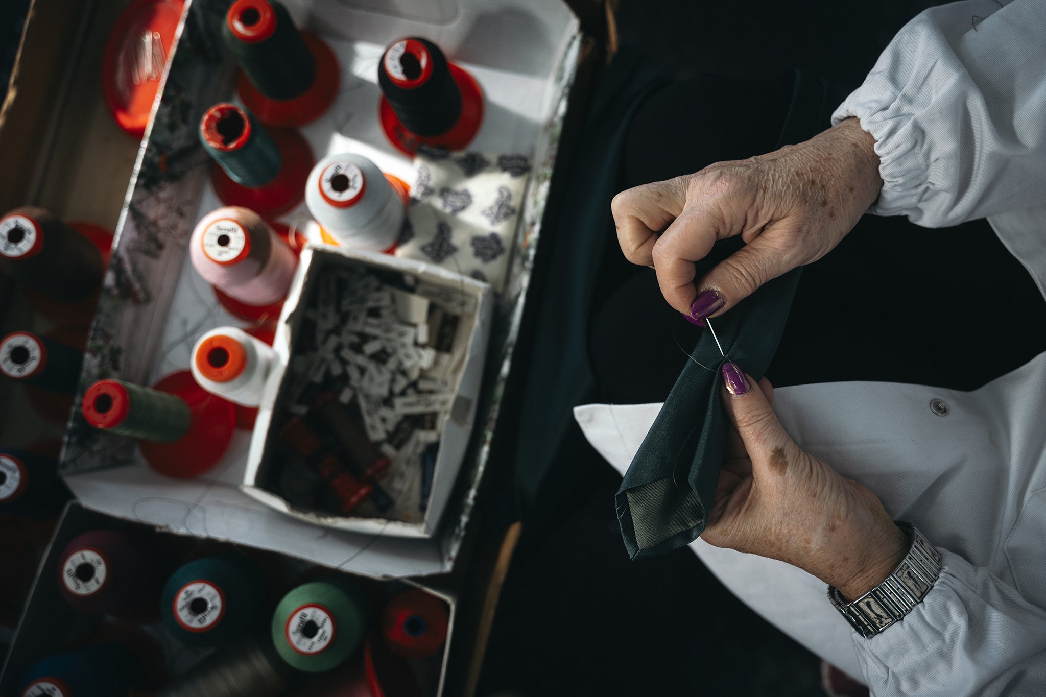 La cravatta viene poi stirata con attenzione per definirne equilibrio e struttura, e completata con l’applicazione dell’etichetta, ultimo gesto che firma l’unicità di ogni creazione.